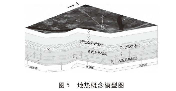 綜合與前人資料與本次淺部地溫測(cè)量、氫氧同位素地球化學(xué)測(cè)試、區(qū)內(nèi)典型地?zé)峋?/a>的抽水試驗(yàn)等成果,分別從熱源、熱儲(chǔ)層、蓋層、地?zé)崃餮a(bǔ)給及運(yùn)移通道建立了勘查區(qū)熱儲(chǔ)概念模型(圖5)。