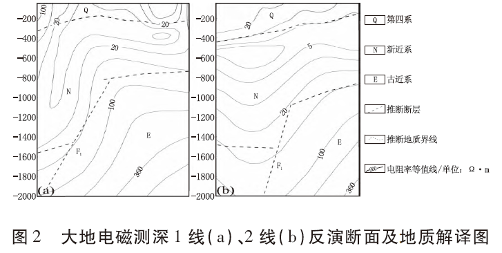 勘查區(qū)內(nèi)主要斷裂構(gòu)造均為區(qū)域性斷裂的次生斷裂,主要有NNE向張完集斷裂F1和EW 向的渦河斷裂F推1(圖1)。前人在區(qū)內(nèi)布設(shè)有兩條大地電磁測(cè)深平行剖面(1線(xiàn)、2線(xiàn)),通過(guò)明顯的“V”型寬大低阻異常和同步向下彎曲典型斷裂異常特征,于區(qū)內(nèi)東側(cè)邊界解譯推斷了走向約40°、NWW 傾的張完集斷裂F1(圖2)。渦河斷裂F推1位于勘查區(qū)南側(cè)亞珠石油城—化肥廠(chǎng)一線(xiàn),該斷裂為亳州隆起的北界斷裂,其主要通過(guò)重力資料推測(cè)為EW 走向、N傾的正斷層。