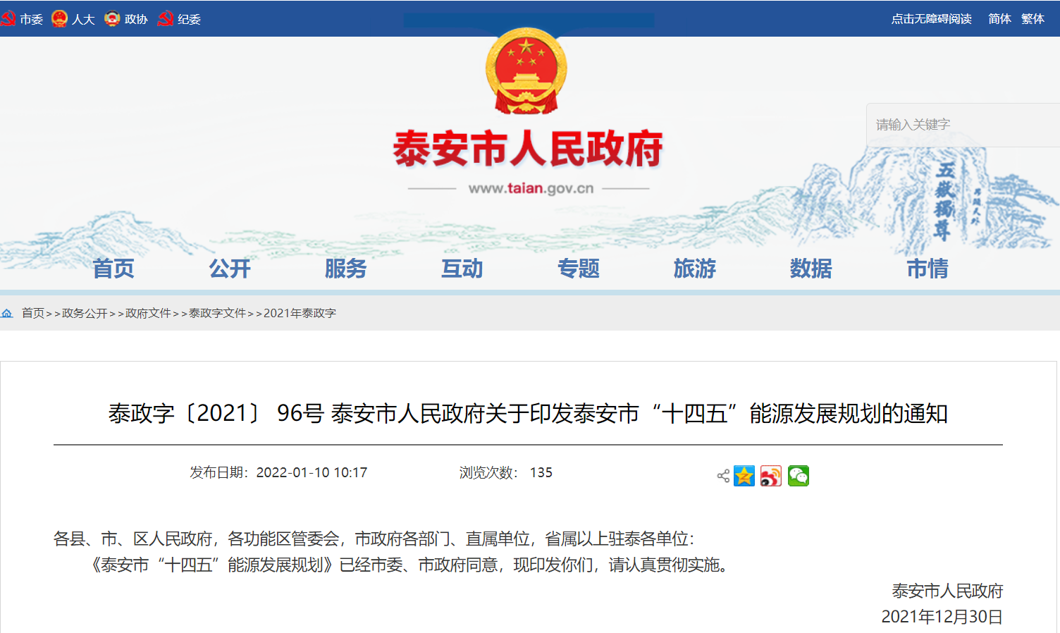 近日,山東省泰安市人民政府印發《泰安市“十四五”能源發展規劃》(以下簡稱《規劃》)。“十四五”期間,泰安市圍繞堅持“創新驅動、綠色低碳、效率優先、多元互補、智能共享”的基本原則,加快構建清潔低碳、安全高效的現代能源體系,深入推進能源生產和消費方式變革,進一步促進全市現代能源經濟高質量發展。