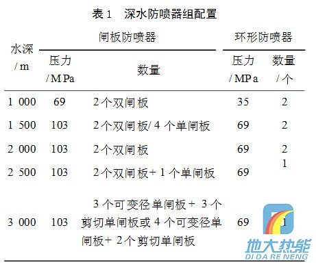 水下防噴器是海洋石油鉆采過程中用于防止井噴發(fā)生的專用設(shè)備,上部連接隔水管裝置,下部連接海底井口裝置。深水防噴器組通常有5個閘板和2個萬能防噴器組成,第5個閘板即底閘板可以剪斷套管,套管剪切閘板位于盲板的下部,以便在剪斷套管后可以關(guān)井,通常在套管可能遇卡或者鉆井裝置需要應急脫離時會用到。2個萬能防噴器是冗余設(shè)計的需要,上部萬能防噴器作為井控的主要手段。根據(jù)水深的不同,深水防噴器組通常有不同的配置。表1是在總結(jié)Transocean公司所有不同水深典型鉆井船防噴器組配置情況得出的,可以作為深水鉆井防噴器組配置的參考。 對于浮式鉆井裝置(半潛式平臺或鉆井船),選用防噴器系統(tǒng)的通徑為?476.3mm(工作水深<600m)或?425.5mm(工作水深>600m),選用封井壓力為69、103、138MPa時,視工作水深、海底至目的層深度和是否為特殊高壓的油氣層而定。為了適應欠平衡鉆井的需要,井口防噴器組合要配置高壓旋轉(zhuǎn)防噴器,即隨鉆壓力控制系統(tǒng)PCWD(Pres2sureControlWhileDrilling)。