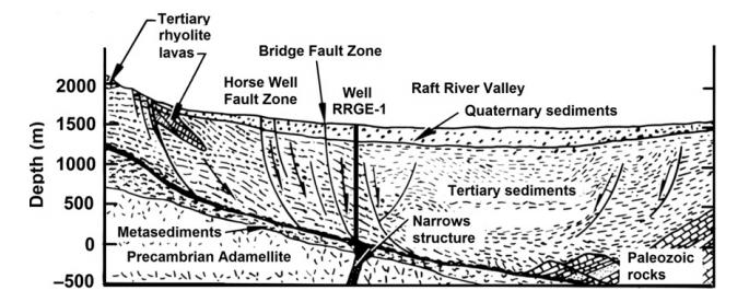 拉夫特河地?zé)崽?/a>的熱儲(chǔ)層,處在一個(gè)盆地中,這個(gè)盆地西部以一個(gè)小角度的斷層為界限,東邊則是由黑松山(Black Pine Mountains)和一個(gè)二次斷層分界。熱儲(chǔ)的蓋層為第三系的沉積層,基底巖石大約厚度為1600m,在這個(gè)深度被一個(gè)東北向的線性構(gòu)造—解理構(gòu)造(Narrows Structure)所貫穿,人們認(rèn)為這個(gè)結(jié)構(gòu)是基底剪切作用產(chǎn)生的。熱源為前寒武紀(jì)二長花崗巖。開始,人們認(rèn)為熱液是通解理構(gòu)造涌上來,然后通過其他的褶皺和斷層蔓延整個(gè)沉積構(gòu)造。現(xiàn)在的人們則認(rèn)為有兩個(gè)熱源補(bǔ)給區(qū),一個(gè)來自西北方向沿著馬井?dāng)鄬臃植嫉难a(bǔ)給區(qū),另外一個(gè)則是來自東南方向的,可能是與變窄構(gòu)造有關(guān)聯(lián)。