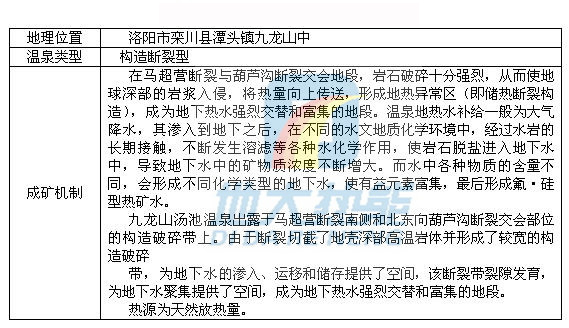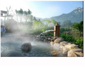 河南省欒川九龍山溫泉風景九龍山溫泉時流量56噸,常年恒溫69.5℃,內(nèi)含鉀、鈉、鈣、鎂、鋰、鍶、碳酸根等27種有益元素,另外含有鈾、氡兩種弱放射性元素,為氟硅復(fù)合型醫(yī)療礦泉水,對風濕、類風濕、肩周炎、關(guān)節(jié)炎、肌肉勞損等疾病有很好療效,對皮膚病、婦科病有特效。因該泉水質(zhì)優(yōu)、流量大、溫度高被稱為中原第一泉,因其醫(yī)療效果顯著,被民間譽為九龍神泉。